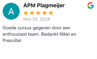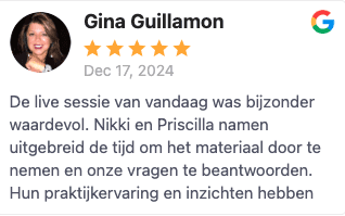 Zojuist de cursusdag gehad en dit heel positief ervaren: interessante, goede, duidelijke informatie. Zowel Nikkie als Priscilla zijn fijne sprekers!